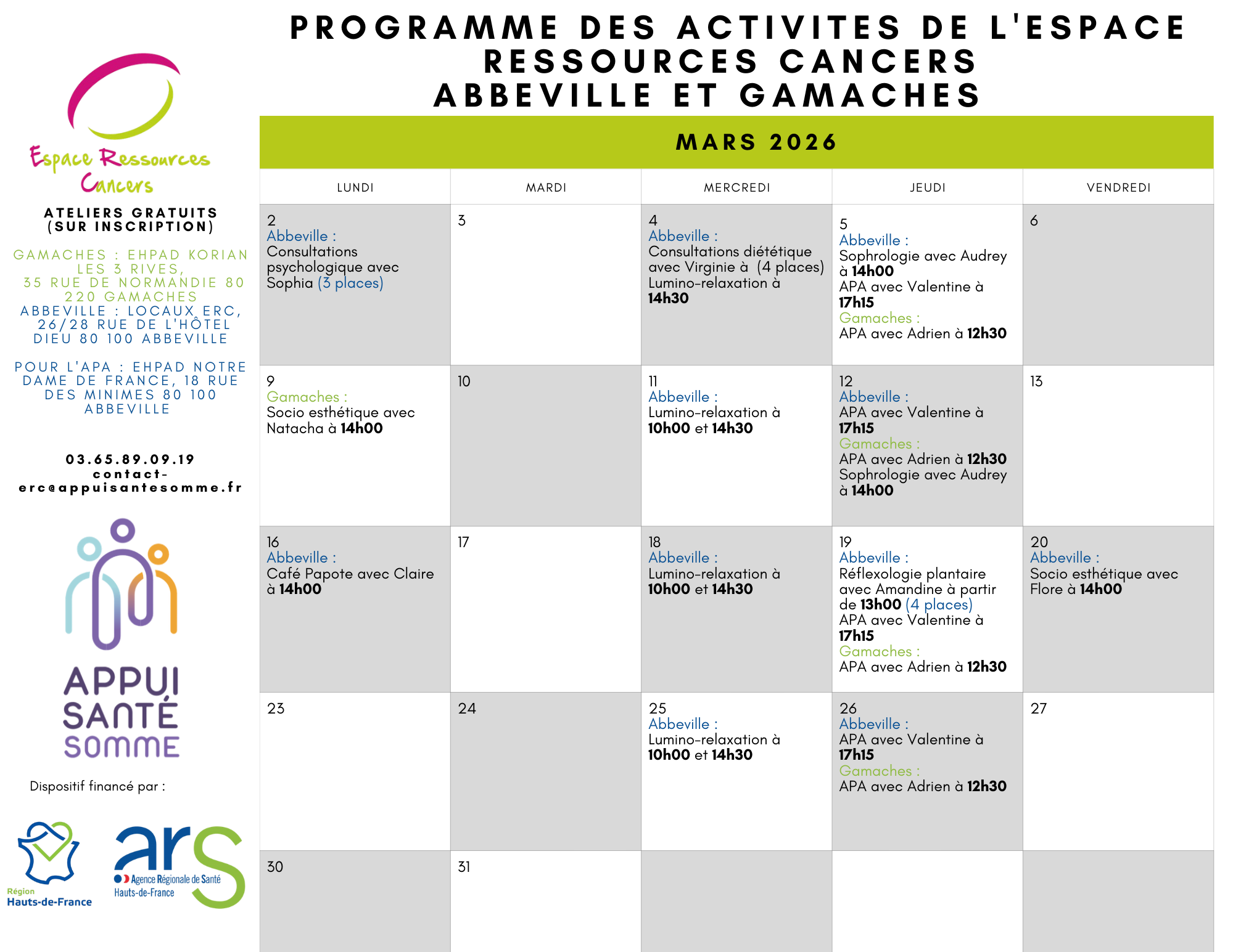 Les activités peuvent être suivies en individuel ou en groupe, à Amiens, Abbeville, Montdidier ou dans d’autres communes de la Somme en lien avec des partenaires locaux.