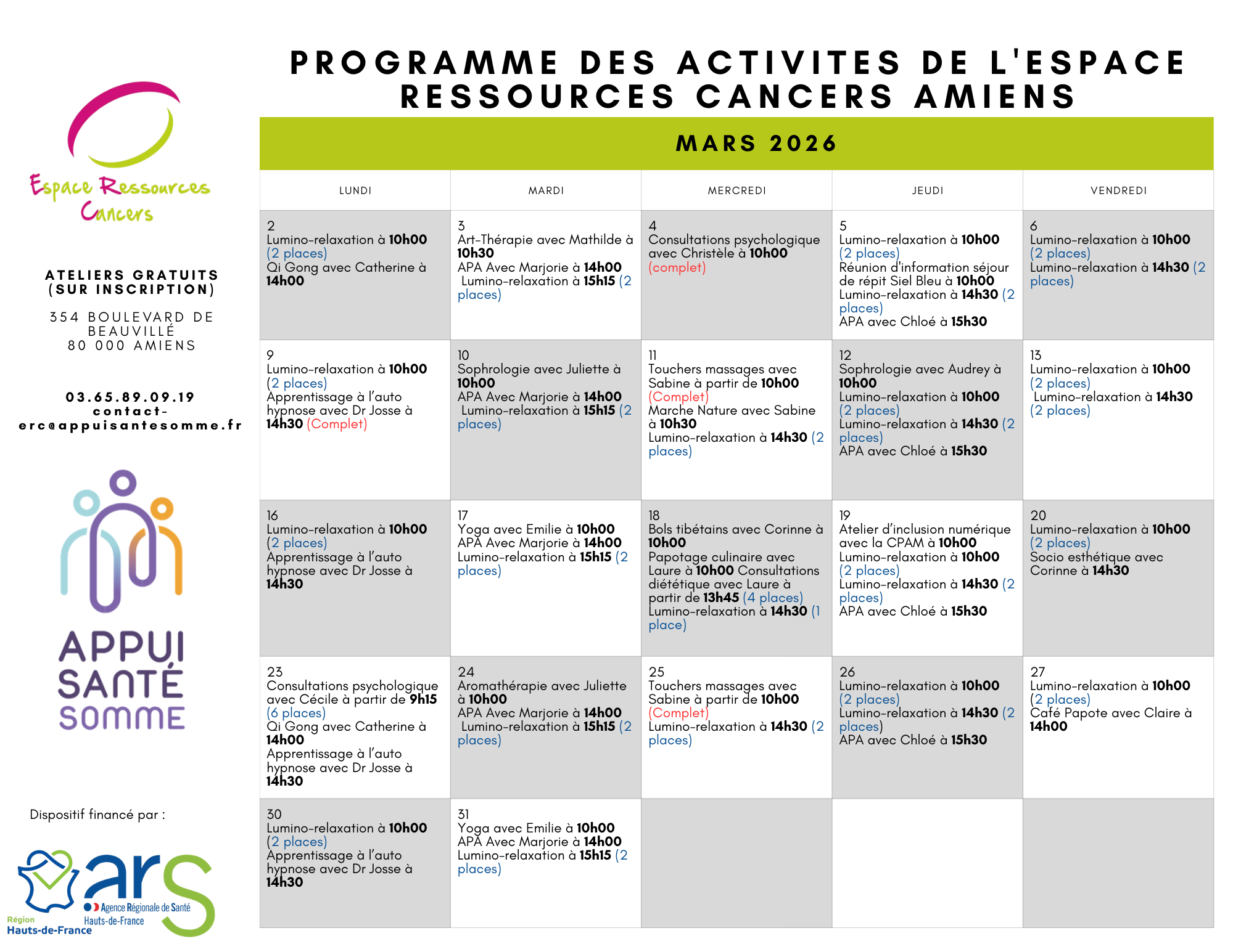 Les dons faits à Appui Santé Somme permettent de maintenir et développer ces offres complémentaires. Ils financent notamment l’intervention de professionnels qualifiés ou l’acquisition de matériel spécifique.